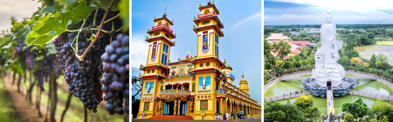 - Tòa thánh Cao Đài Tây Ninh, nơi đây được xem như thánh địa khai sinh ra Đạo Cao Đài. Với kiến trúc độc đáo, thể hiện một sự dung hòa của nhiều yếu tố tâm linh từ Đông sang Tây, Tòa Thánh Tây Ninh không chỉ là nơi hành hương của các tín đồ đạo Cao Đài mà còn thu hút một lượng lớn du khách trong và ngoài nước tới tham quan mỗi ngày.